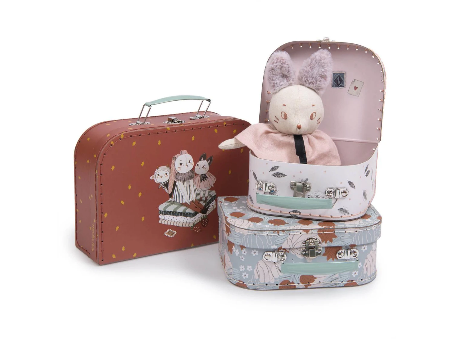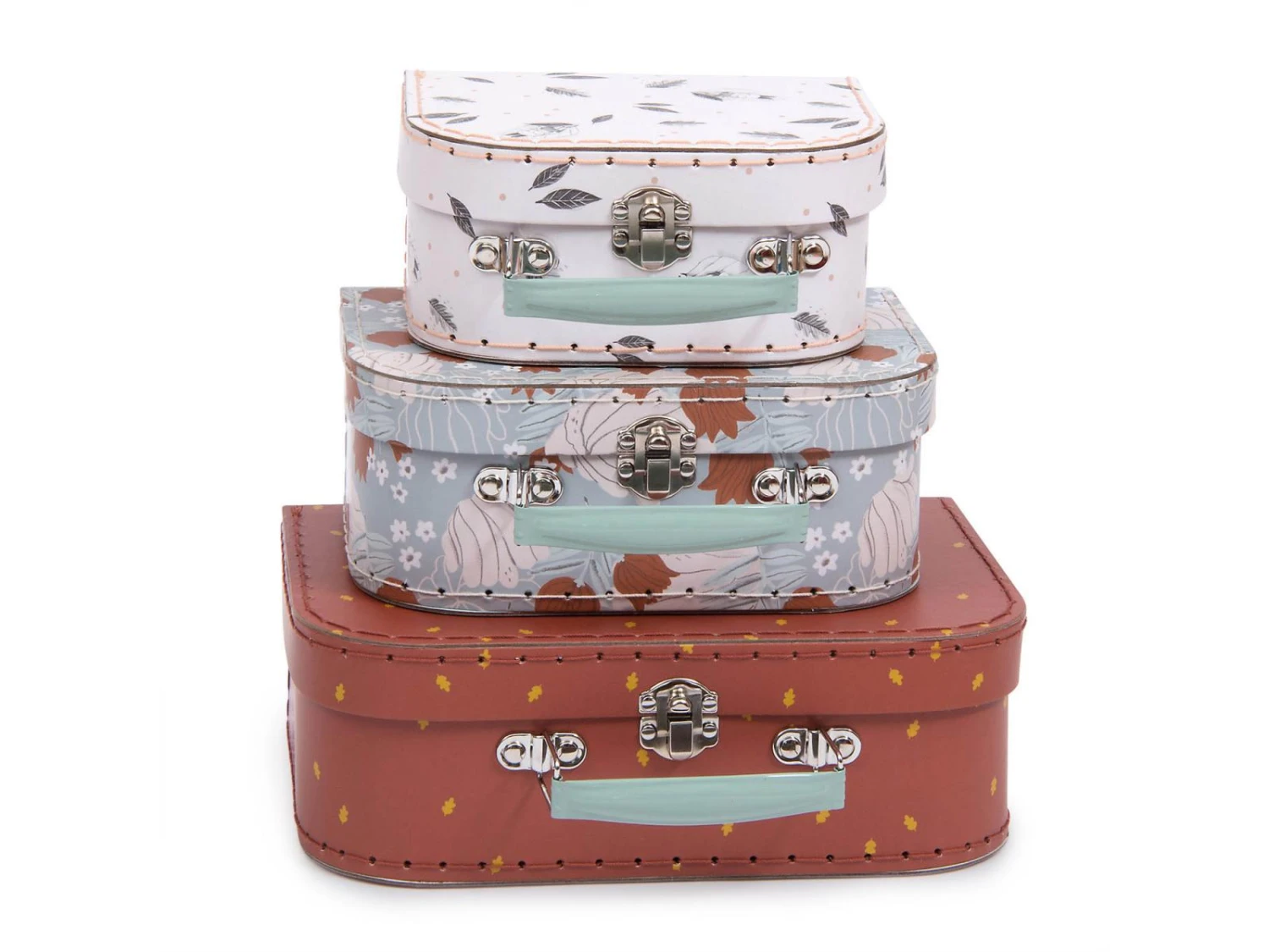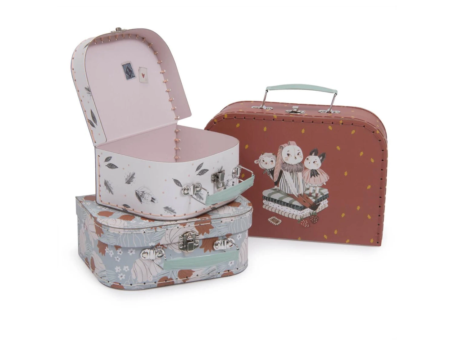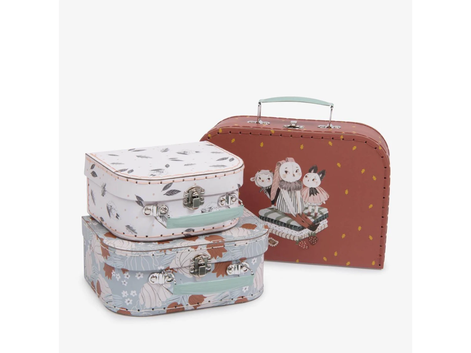 Set de 3 valises déco de formats différents, en carton avec finition cousue, poignée et ouverture métal. Illustrées de l’univers délicat d’Après la pluie, elles permettront de ranger et transporter tous les personnages et trésors de la collection !