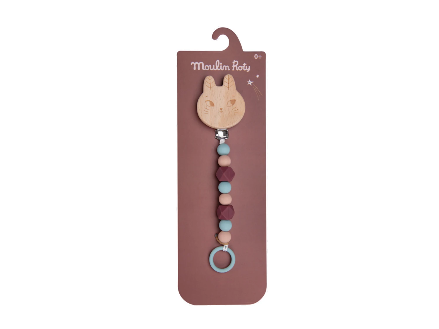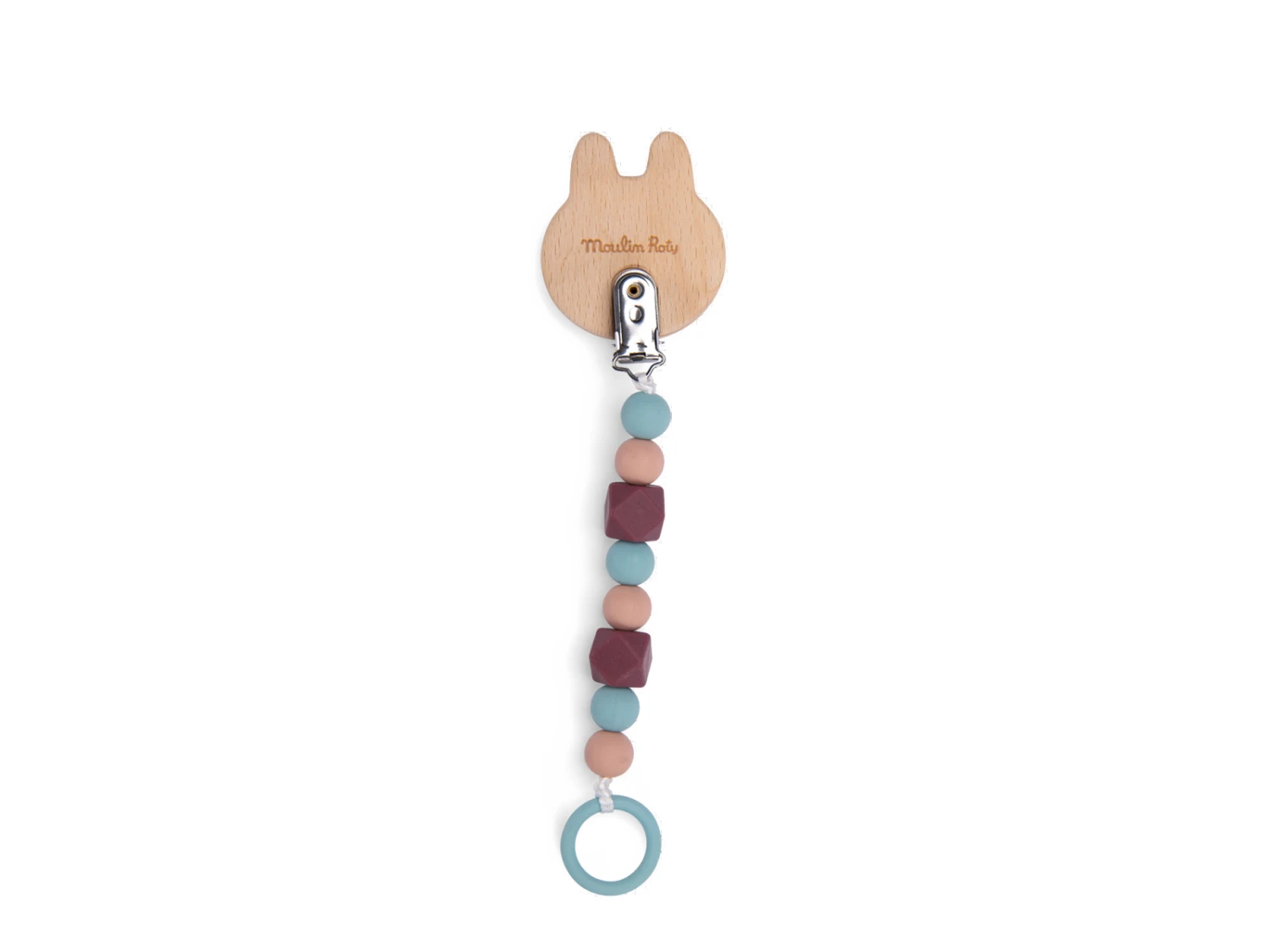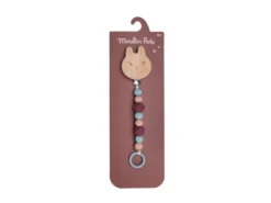 Attache-tétine lapin en bois et silicone pour ne plus perdre la sucette de bébé. S’attache facilement à tout support grâce à son clip ajustable. Les perles de silicone sont sans danger pour bébé, il pourra jouer avec et les mâchouiller.
