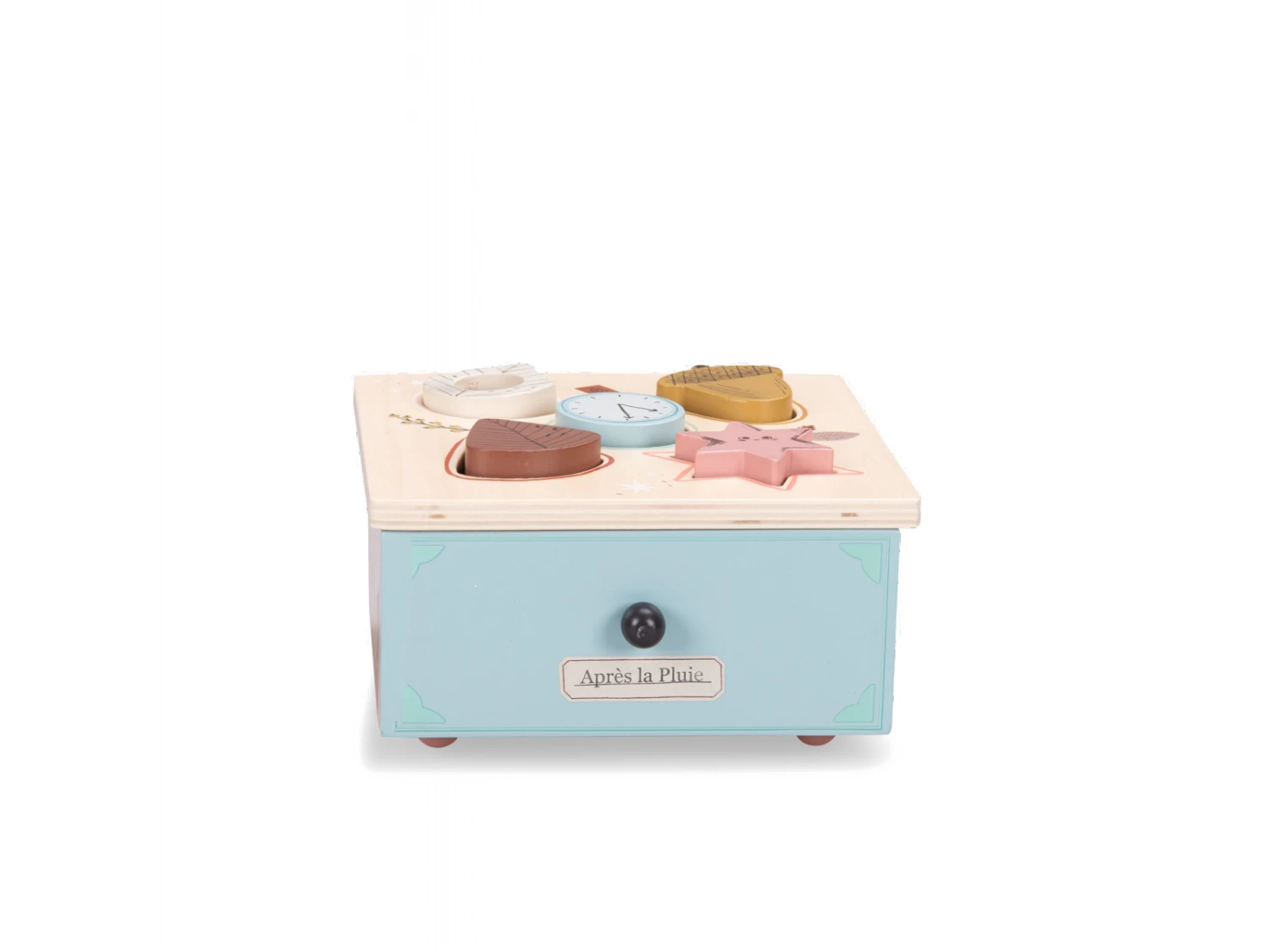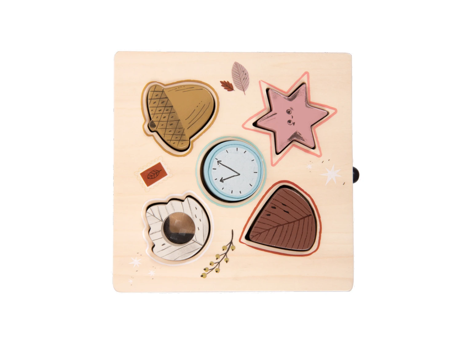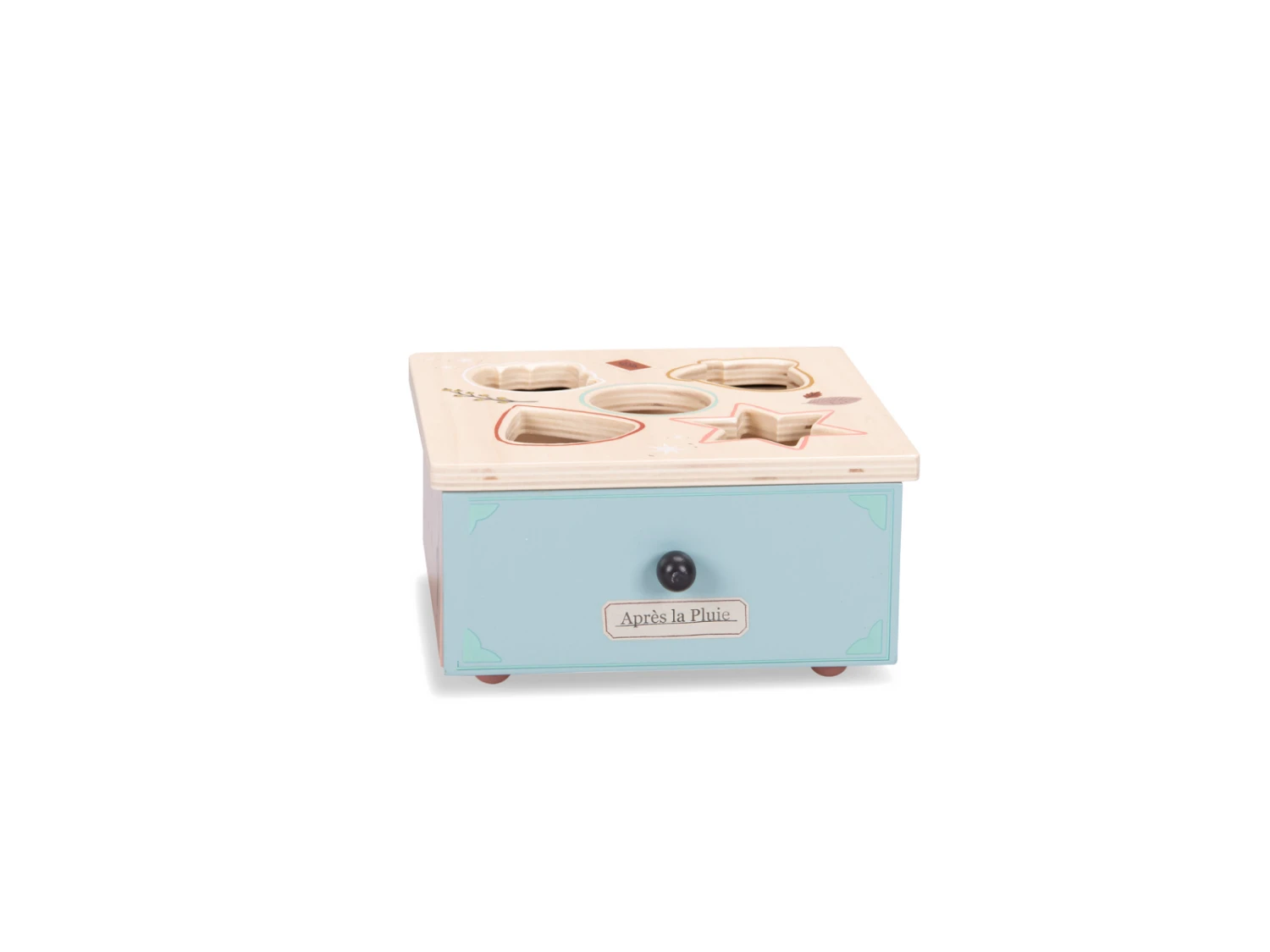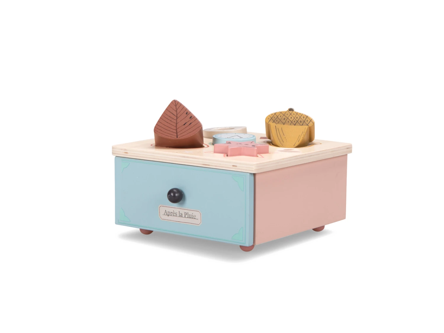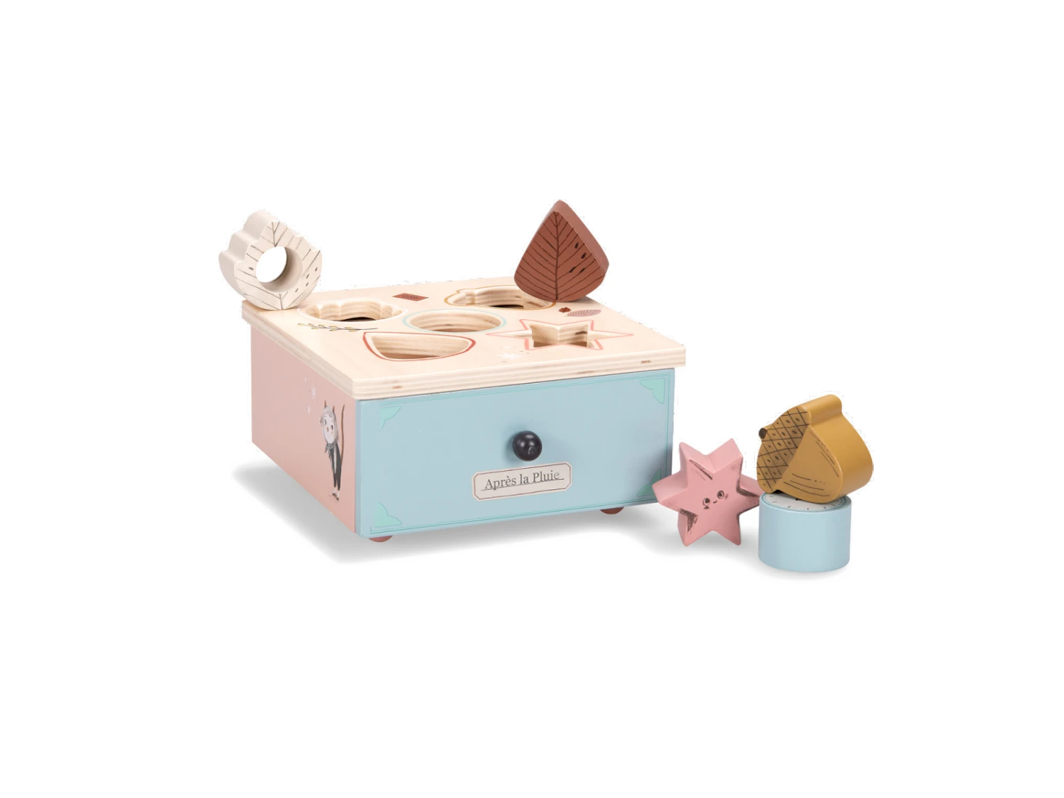 Boite en bois joliment illustrée pour apprendre les formes et les couleurs. Contient 5 formes à manipuler, conçues pour les petites mains. Autour de chaque trou, se trouve la couleur de la forme à encastrer pour guider bébé à choisir le bon emplacement.