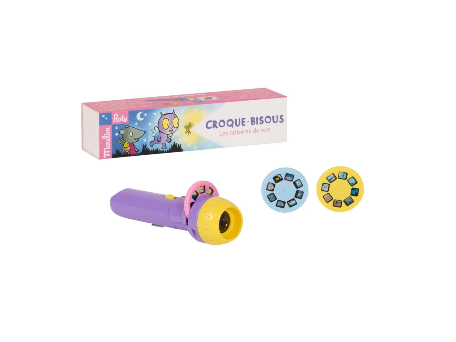 Lampe torche de poche où chacun des 3 disques projetés sur le mur raconte les aventures de Croque-Bisous, héros de l’école des loisirs. Pour endormir les tout-petits et développer leur imagination !