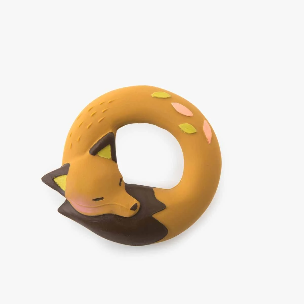 Anneau en caoutchouc 100% naturel, issu de la sève d’Hévéa, avec Chaussette le renard et ses feuilles d’automne. Pour soulager les dents de bébé ou jouer dans le bain, il n’a ni trou ni sifflet pour éviter l’accumulation de saletés à l’intérieur.