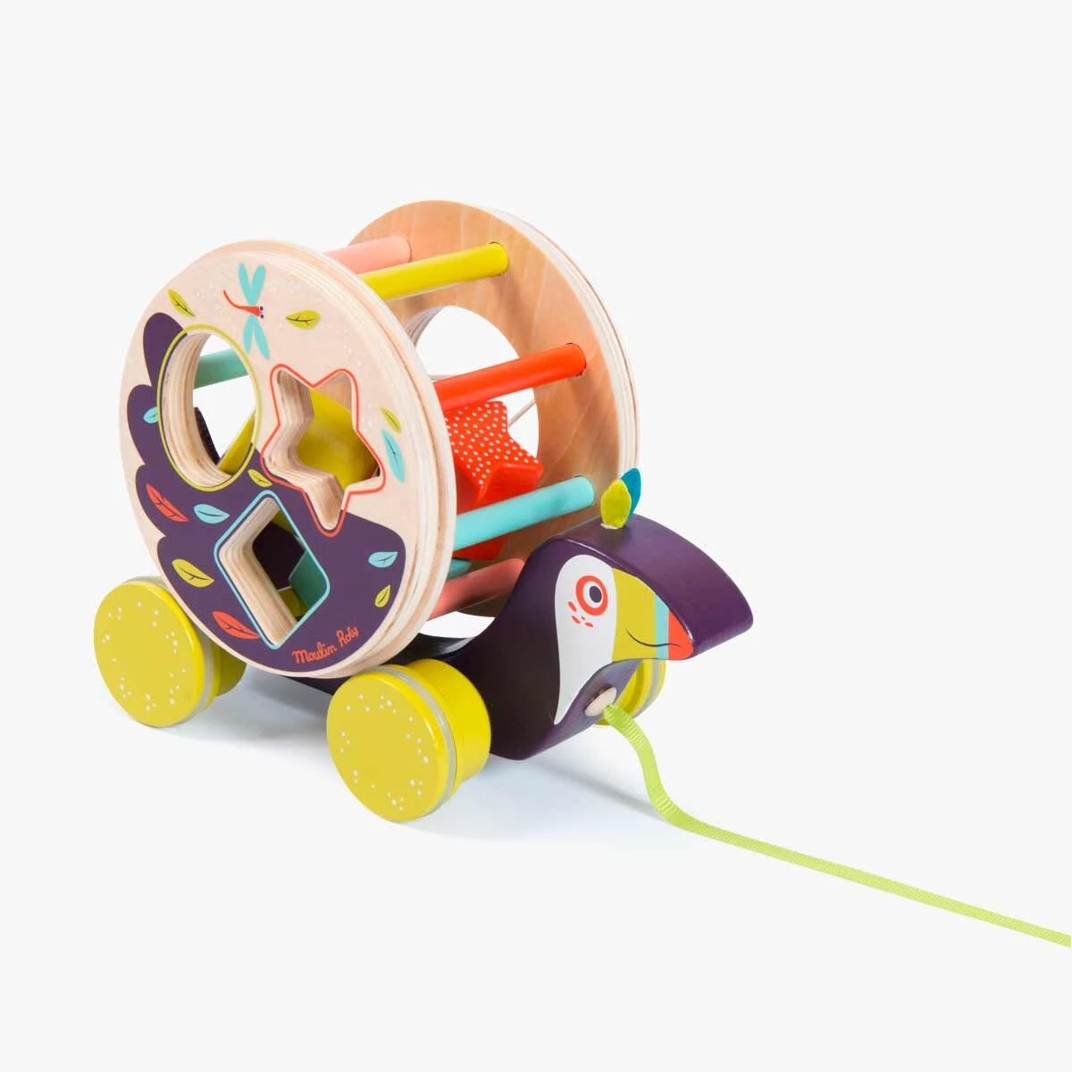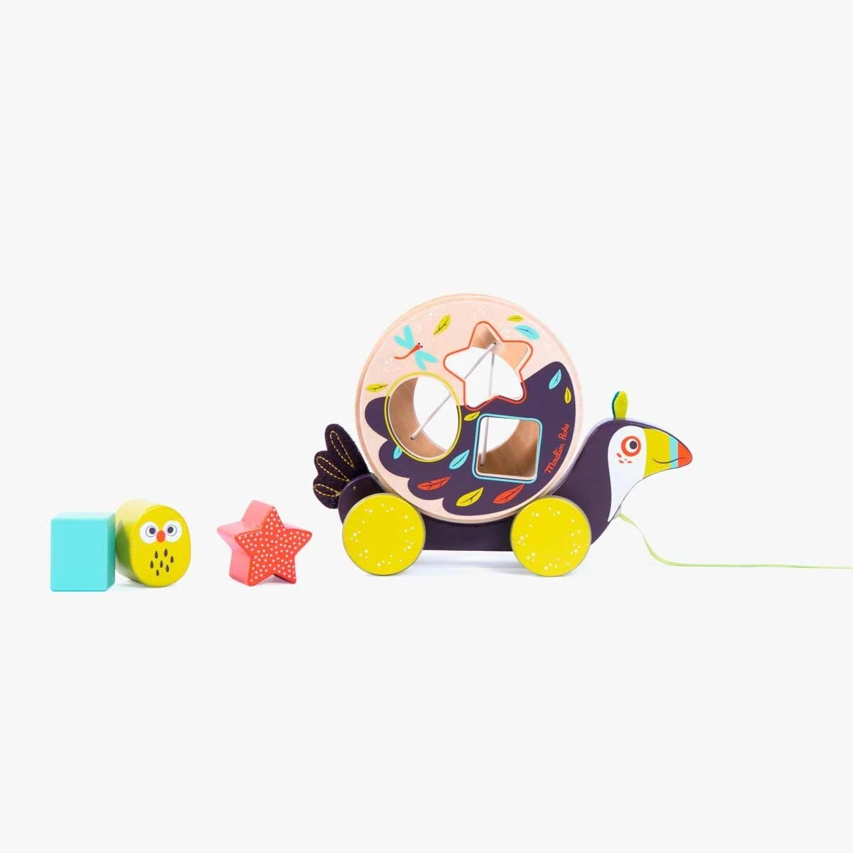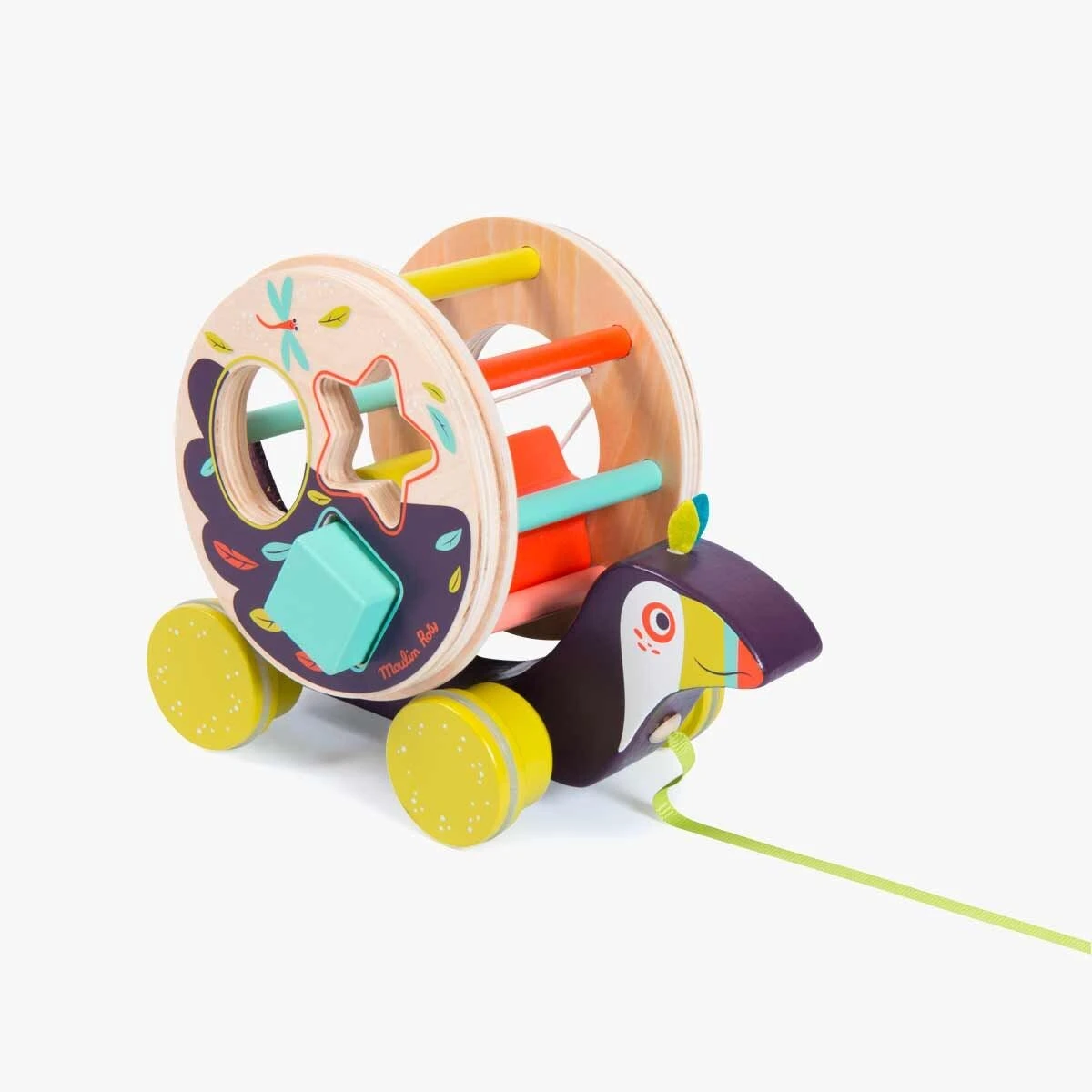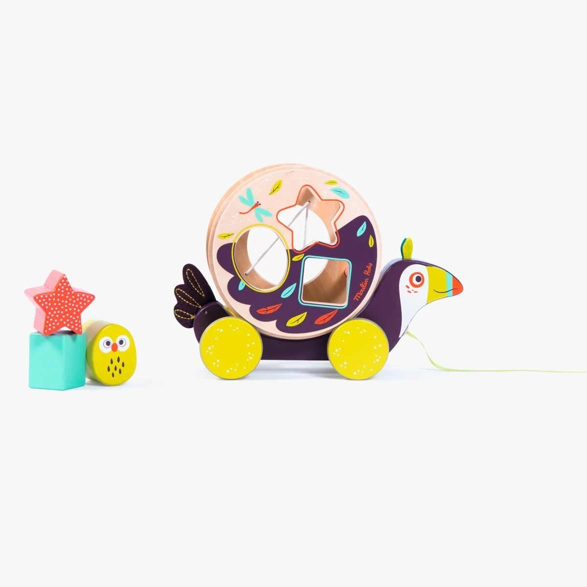 Toucan boîte à formes à tirer en bois très coloré et illustré. Comporte trois formes géométriques à encastrer et un grelot qui fait du bruit quand la roue tourne. Développe la motricité de l’enfant et lui apprend les formes et les couleurs.