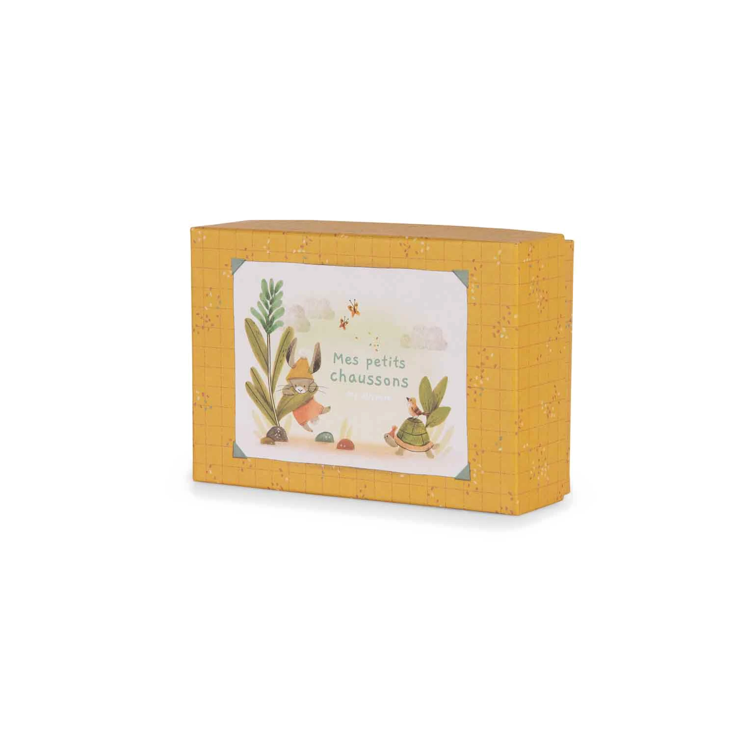 Petits chaussons lapin douillets. Avec leurs adorables frimousses à moustaches et leurs mélanges de matières douces (fourrure, velours éponge, jersey flammé), ils sont à croquer. Présentés dans une jolie boîte cadeau illustrée.