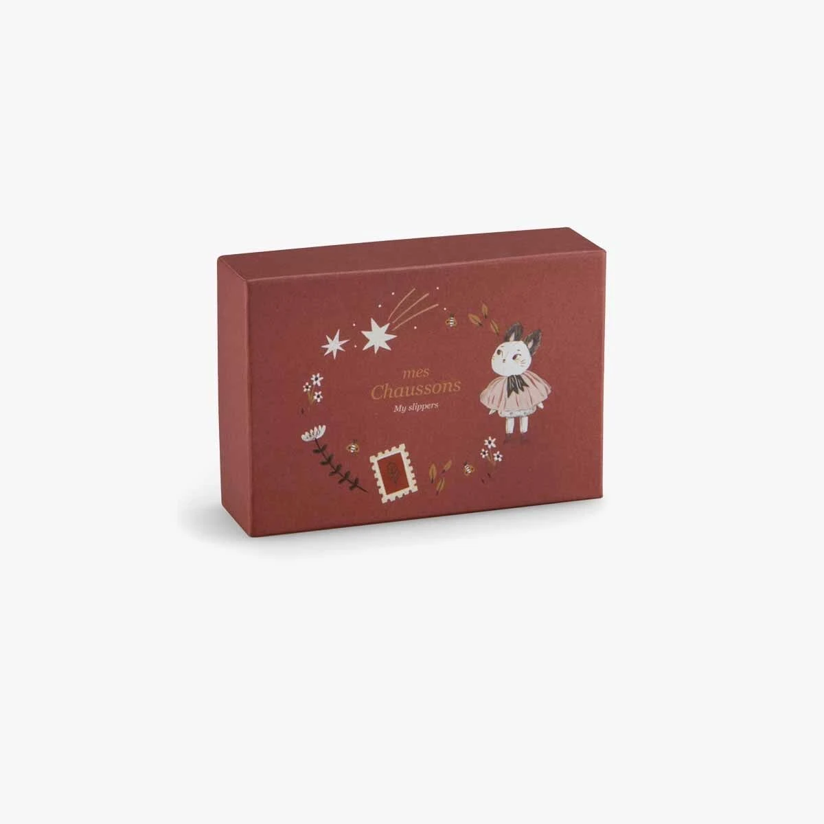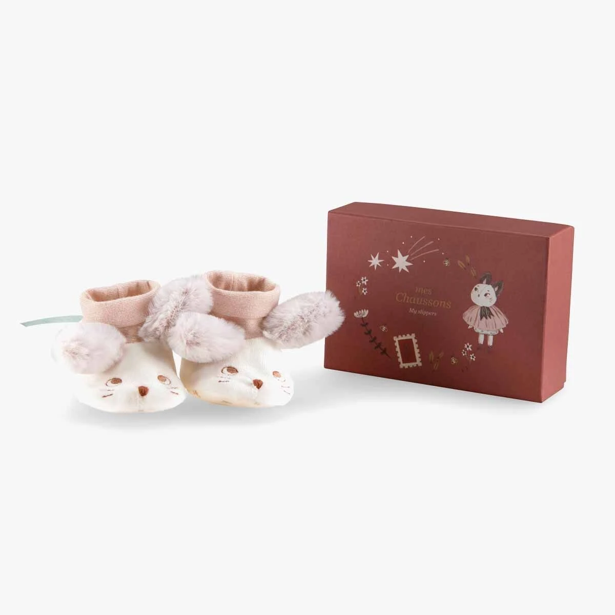 Une souris, deux souris… sur les petons de bébé ! Adorables chaussons blancs aux grandes oreilles parmes toutes douces, avec semelles en coton et jersey élastique pour bien tenir à la cheville. Ils se rangent dans une jolie boîte illustrée.