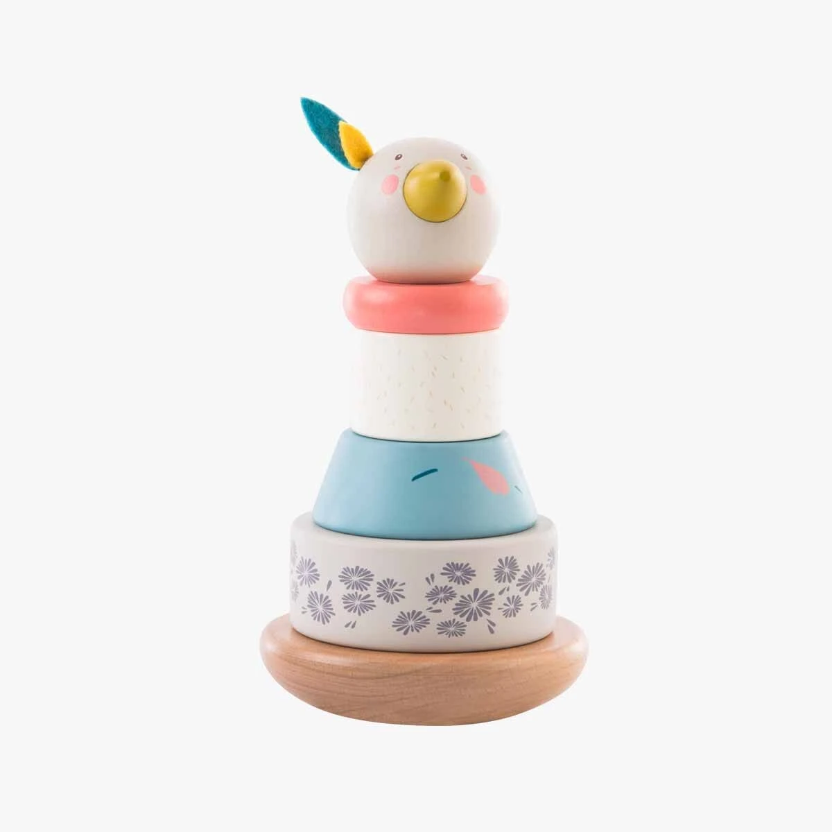 Pièces en bois empilables, peintes aux couleurs tendres et raffinĂ©es de la gamme, illustrĂ©es de motifs poĂ©tiques, pour former l’oie Olga. IdĂ©al pour dĂ©velopper la motricitĂ© des tout petits.