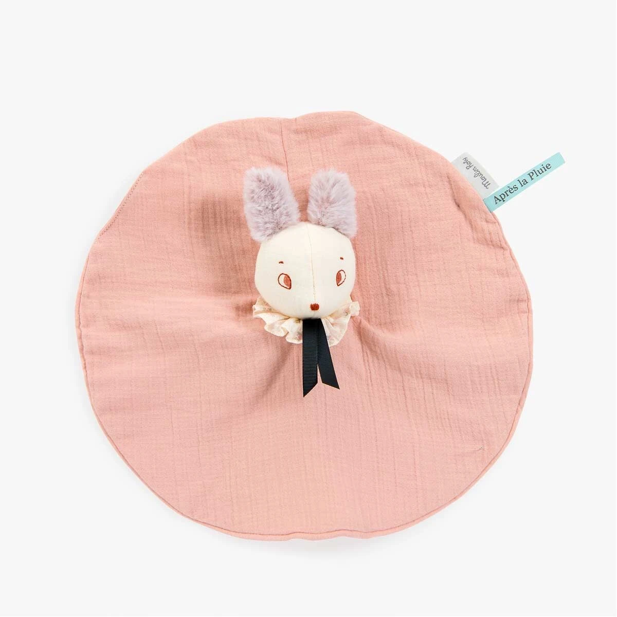 Doudou Brume avec sa robe en lange rose poudré, surmontée d’une collerette à fleurs. Son adorable minois brodé et ses grandes oreilles en fourrure se glisseront auprès de bébé pour ses moments de rêverie. Il peut être brodé au prénom de l’enfant.