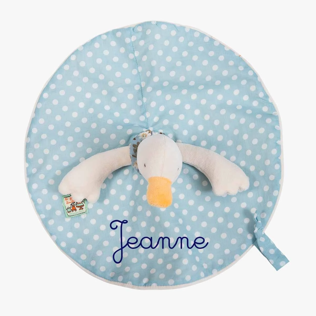 Petite Jeanne la canne, dans sa robe en coton imprimé pois, doublée velours pour ce doudou plat, facile à saisir par les petites mains de bébé. Il comprend un lien attache tétine. Peut être brodé au prénom de l’enfant. Idéal pour un cadeau de naissance.