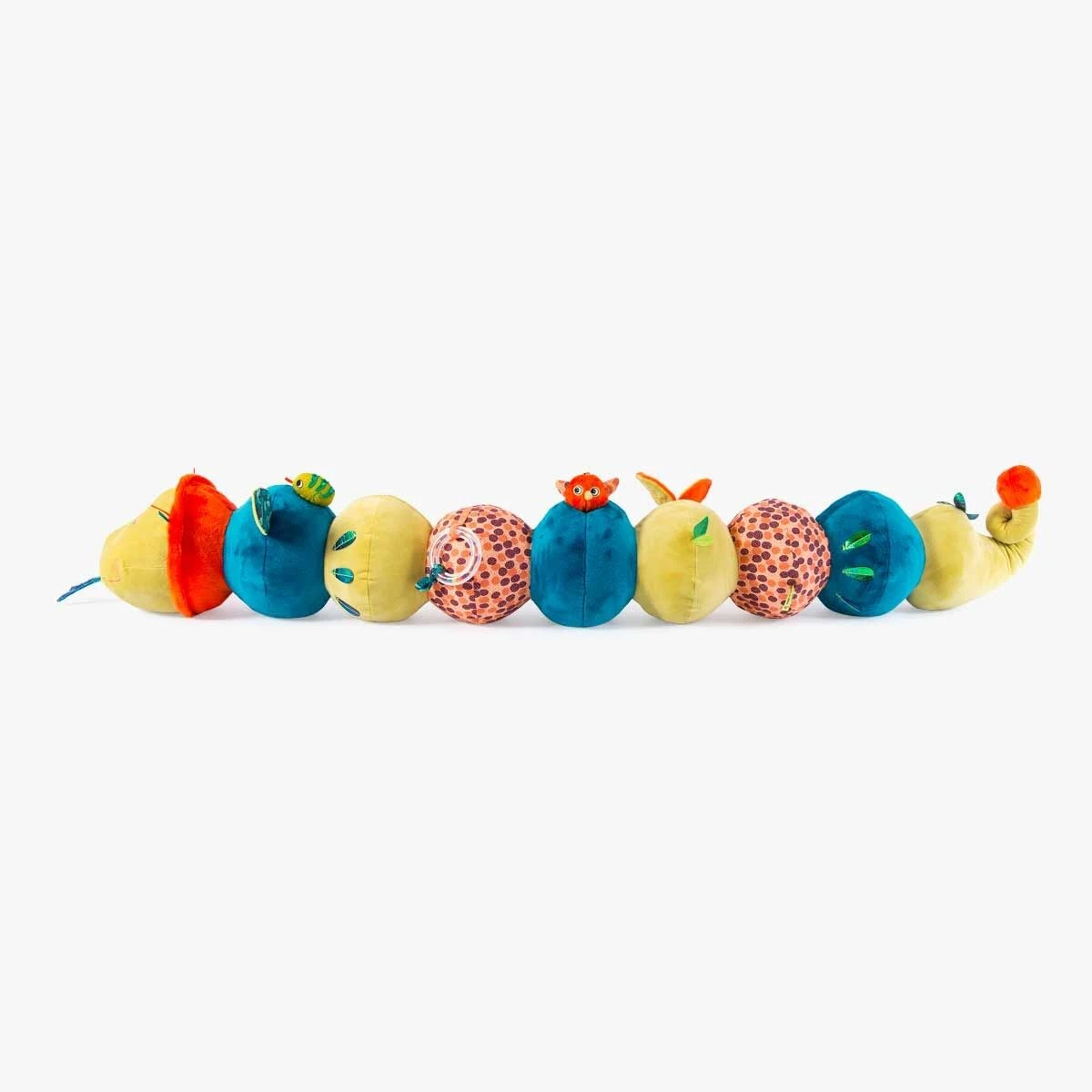 Oh la la, mais qui voilà… Un serpent d’activités de plus de 2 mètres ! Coloré, à motifs… il ne passe pas inaperçu ! Sur lui se trouve des fleurs-grelots, un petit poussin suspendu, un hochet anneau billes, un caméléon, un papillon…
