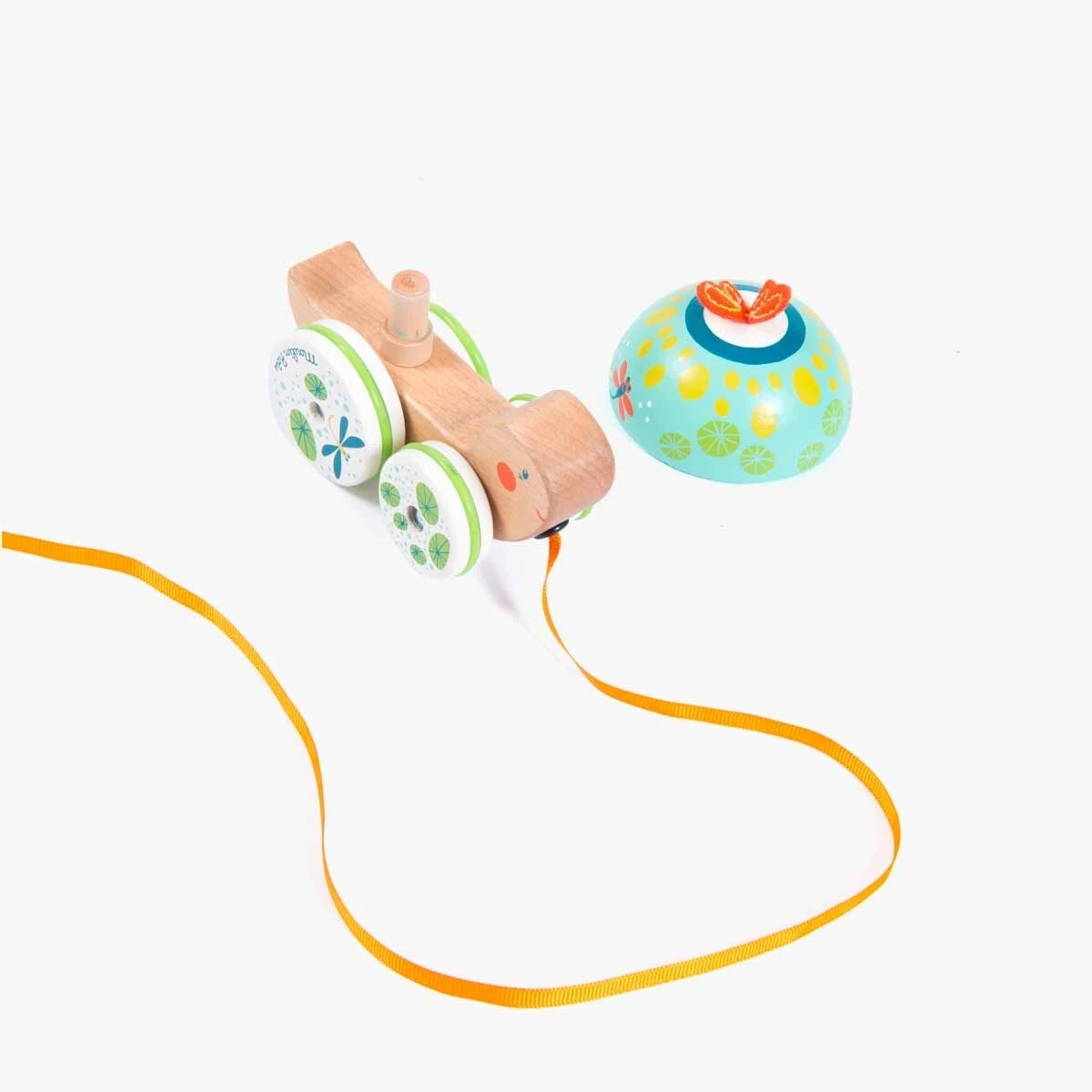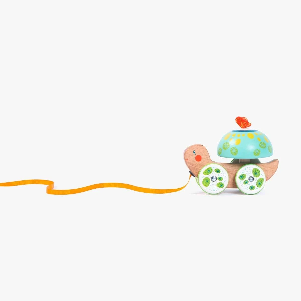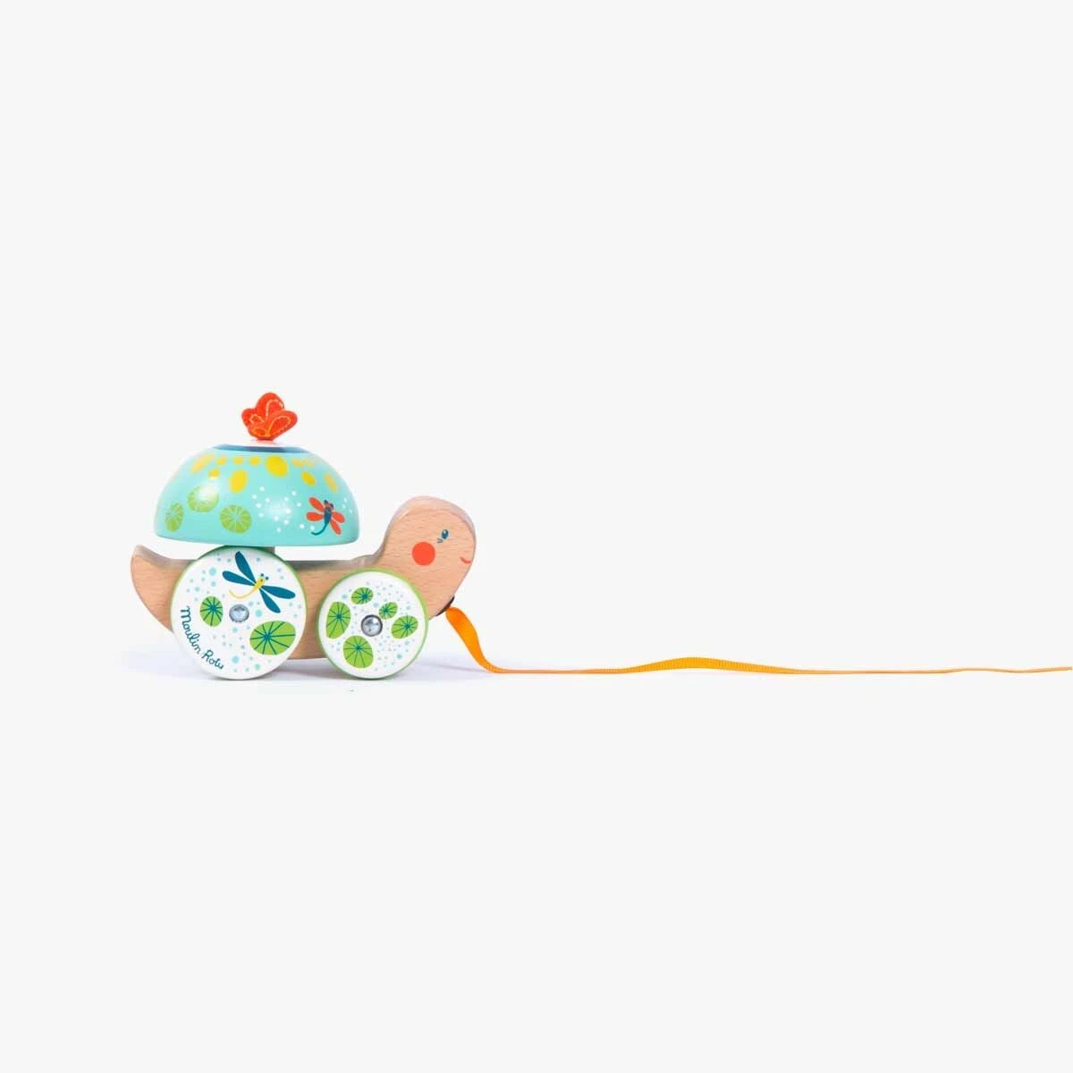 Tortue à tirer en bois coloré, imprimé de motifs et illustrations. Quand elle roule, sa carapace tourne sur elle-même ! Développe la motricité de l’enfant. Jouet à tirer par un ruban.