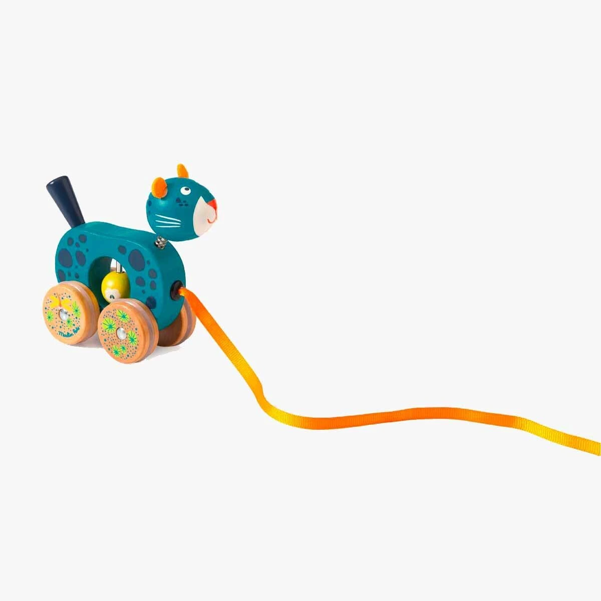 Petite panthère à tirer en bois coloré et illustrations imprimées. Dans son ventre, un grelot fait du bruit, et sa tête fixée sur ressort s’agite quand la panthère avance ! Jouet à tirer par un ruban. Développe la motricité de l’enfant.